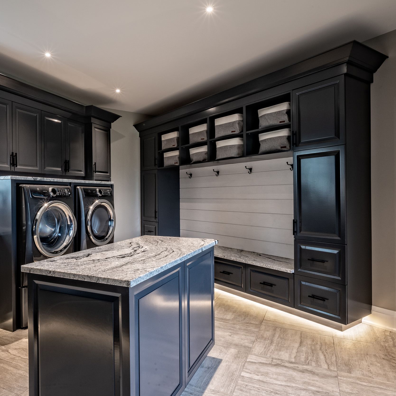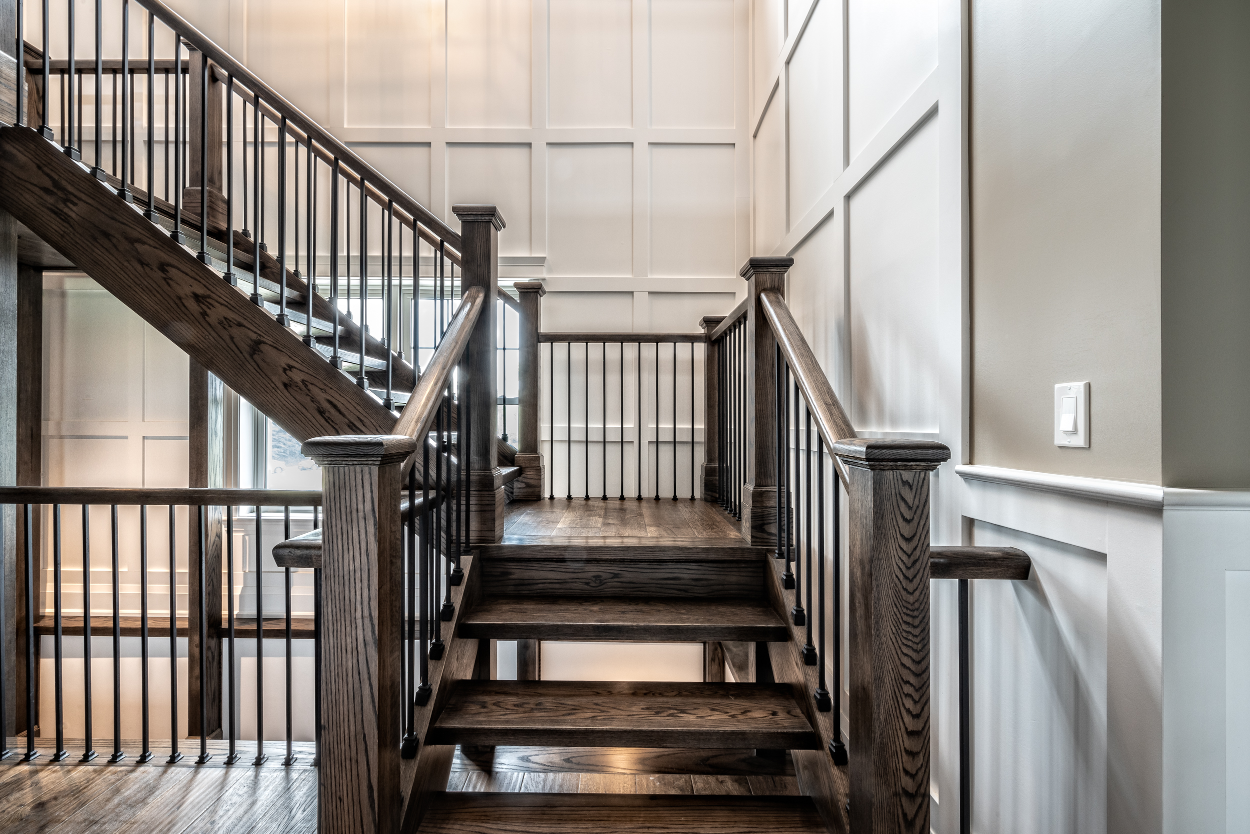 The Millars came to the table with high expectations of John and his team, and they weren’t disappointed. “Jon’s parents had already worked really well with him, so we knew we were in good hands,” Ashley explains. “We showed him our vision, and then we met many times to tweak things along the way, and he did an excellent job.” In fact, the first draft of the custom design was pretty close to the final version, and it included some bright ideas inspired by John’s past projects. “We wanted to add a loft, and we wanted the stairs to be at the front of the house instead of the middle, because we didn’t want to divide the basement once it was finished,” Ashley says. “Now the basement is wide open, and we have a three-storey staircase from top to bottom that’s a unique feature.” That floating staircase may not be in the middle of the home, but it’s definitely a centrepiece. “The builder did a lot of head scratching over how he could build a staircase that big without it being anchored to the walls, but it turned out incredible, and it doesn’t break up the open spaces on any of our floors,” Jon adds.